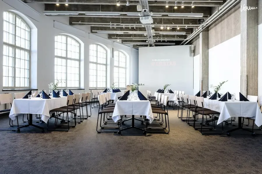 Pitkien pöytien ääreen voi kattaa hääillallisen noin 20–60 hengen seurueille, jolloin kaikki ovat yhtenäisessä tilassa. Industrial-tyyli yhdistyy täällä moderniin nykytaiteeseen, mikä tuo tilaan kiinnostavaa kerroksellisuutta.