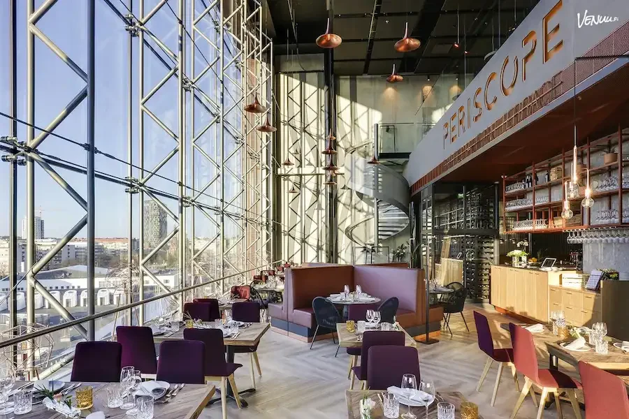 Periscopen ravintolasali edustaa Tampereen uudempaa kaupunkikulttuuria, jossa industrial-henkiset häät saavat modernin ja urbaanin tulkinnan keskellä kaupungin sykettä. Skandinaavinen sisustus on selkeä mutta lämmin, ja se parittuu upeasti teollisten yksityiskohtien kanssa. Näyttävät näkymät kaupungin ylle suurista ikkunoista luovat häätilaan ilmavuutta ja avaruutta.